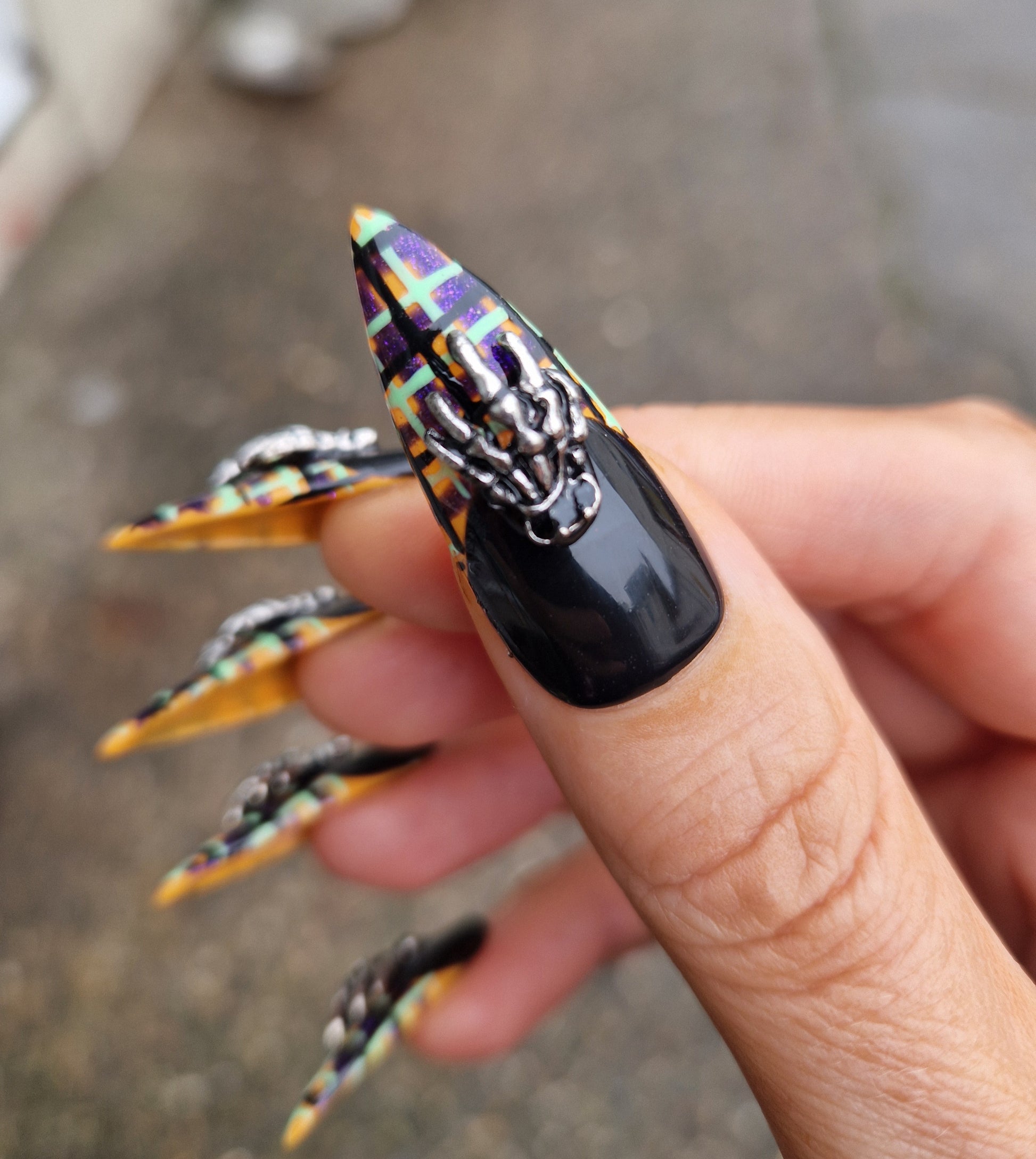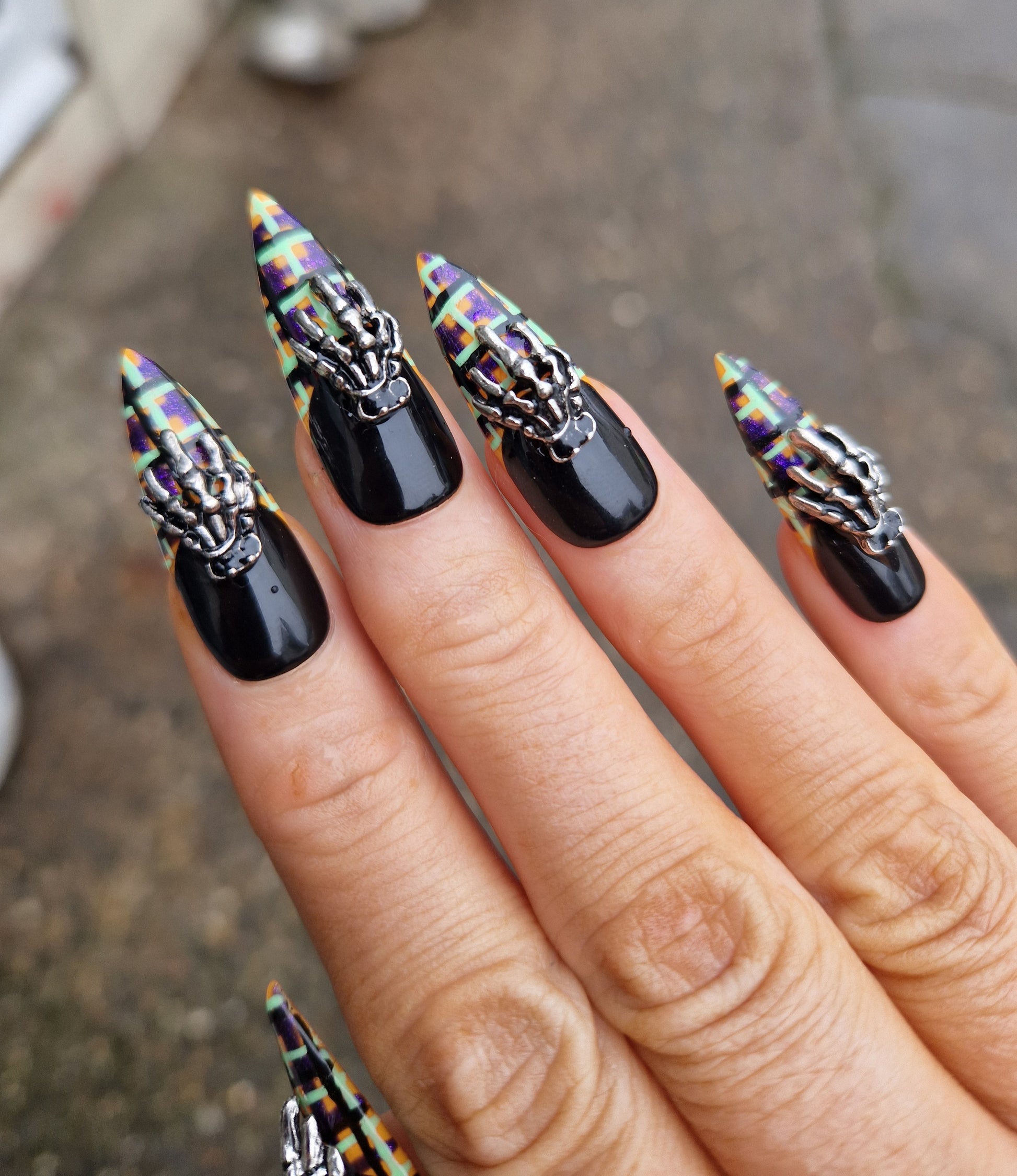 Python Nails AUTUMN PLAID has a black base with a plaid French tip featuring spooky colours and a skeleton hand charm.