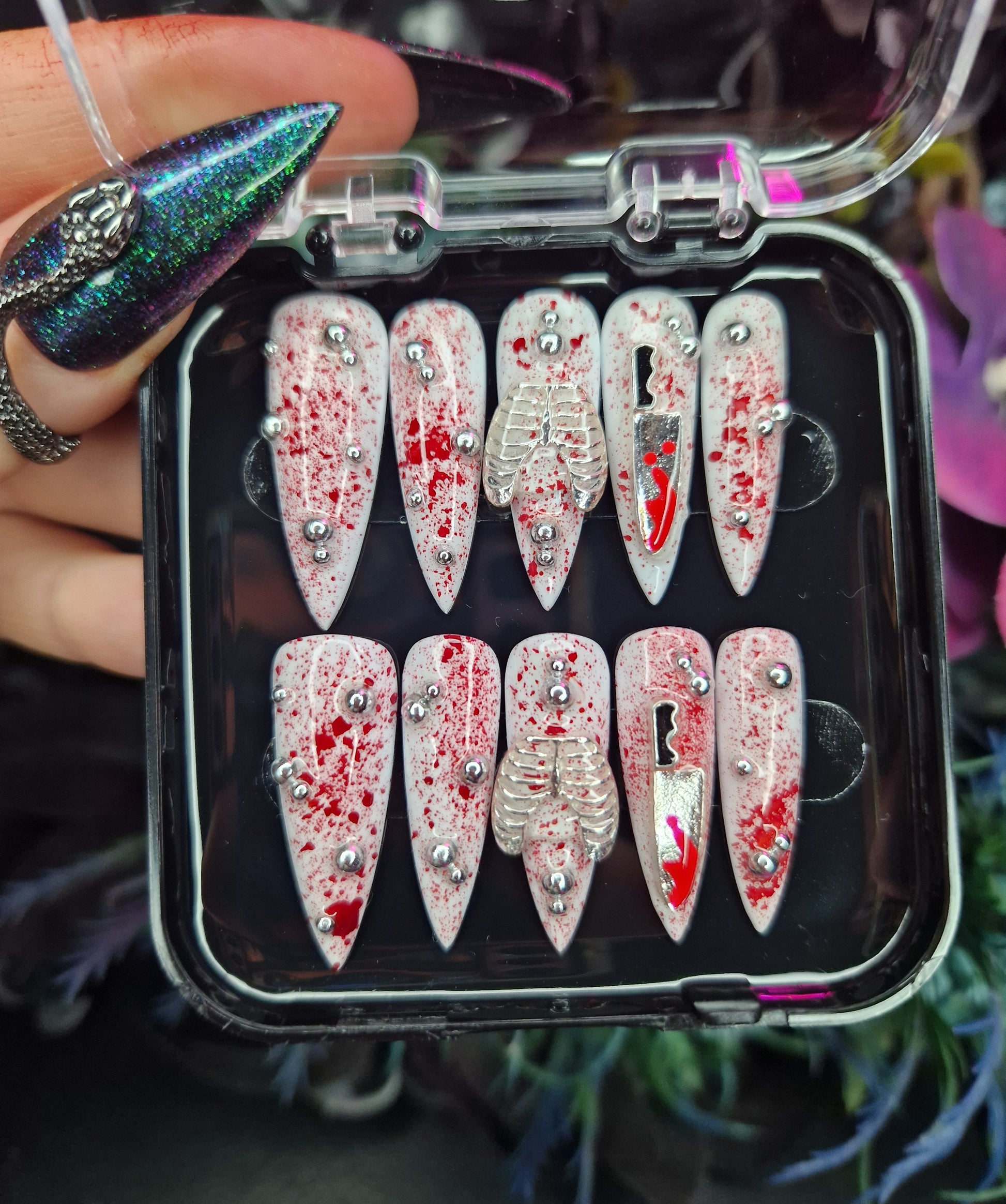 Python Nails CAGED are a white blood splat nail with spooky silver nail charms.