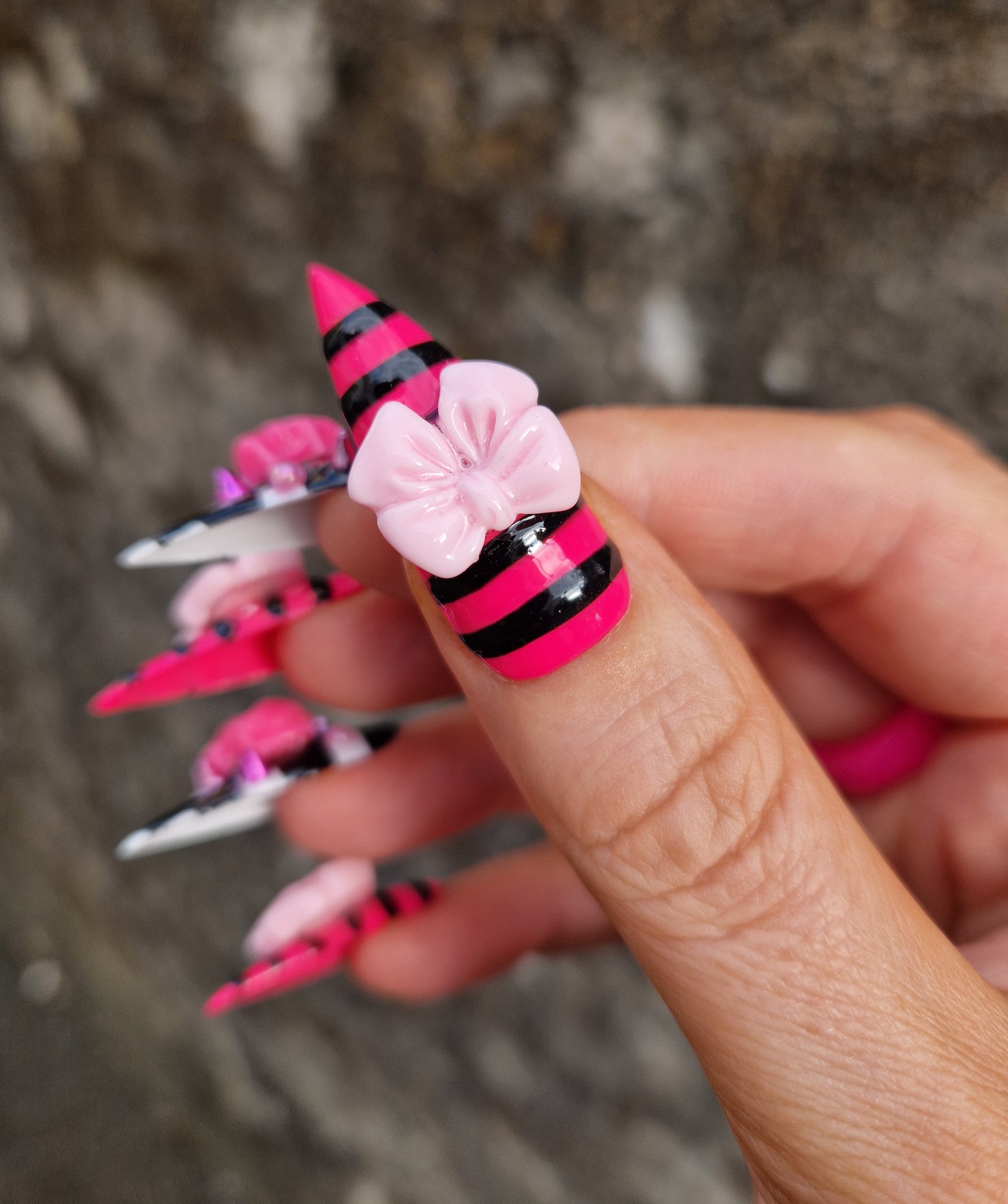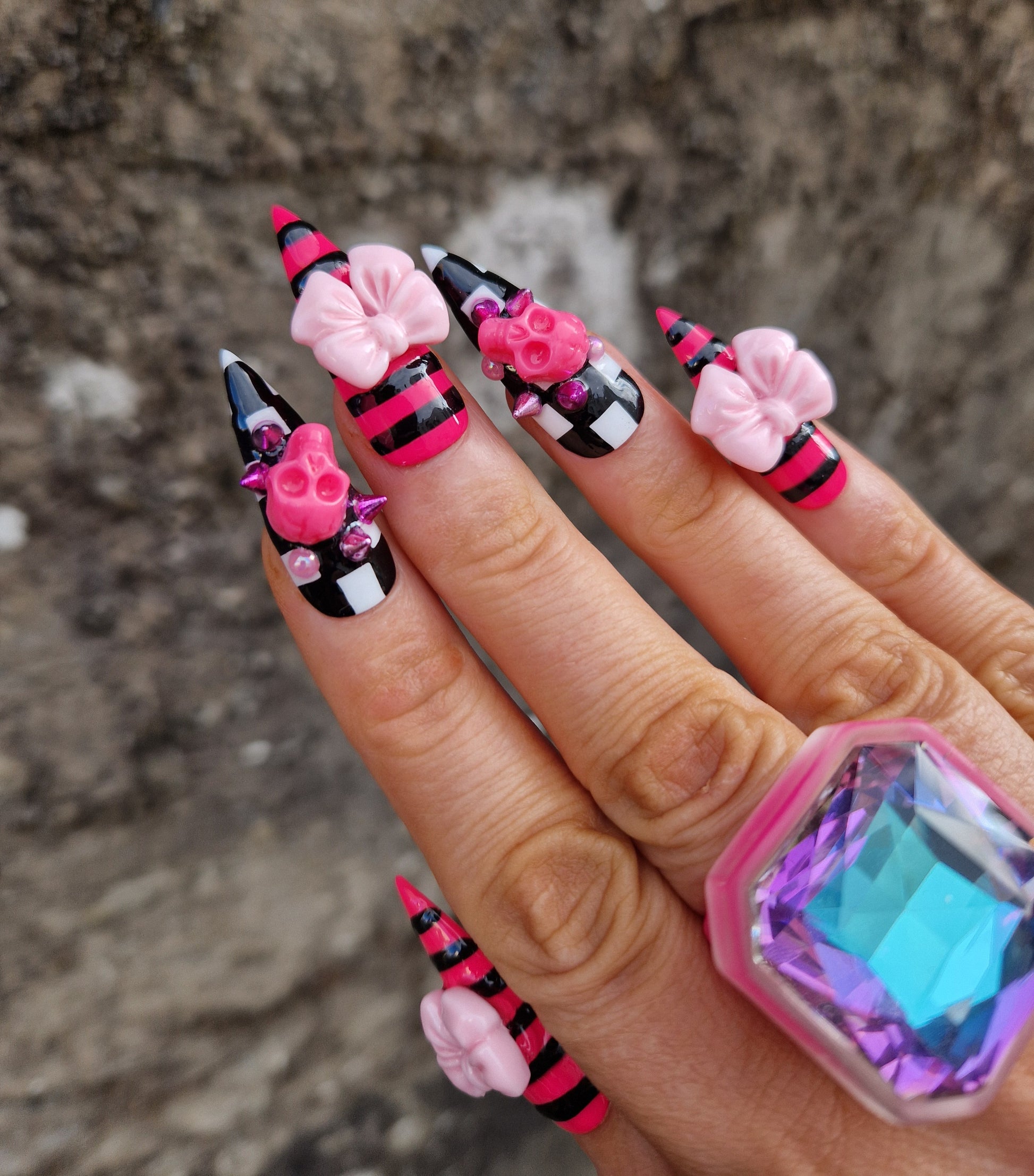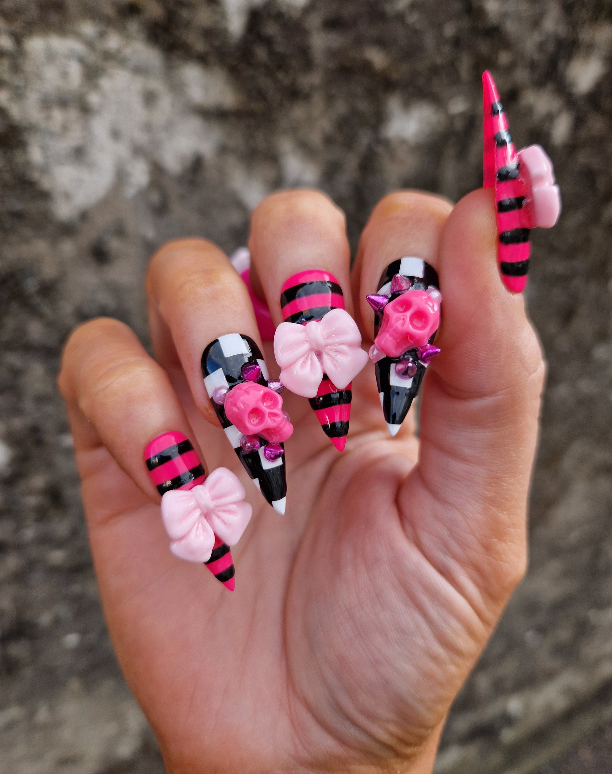 Python Nails DISTURBED is giving emo y2k with checkerboard and stripes finished with charms bows and spikes.