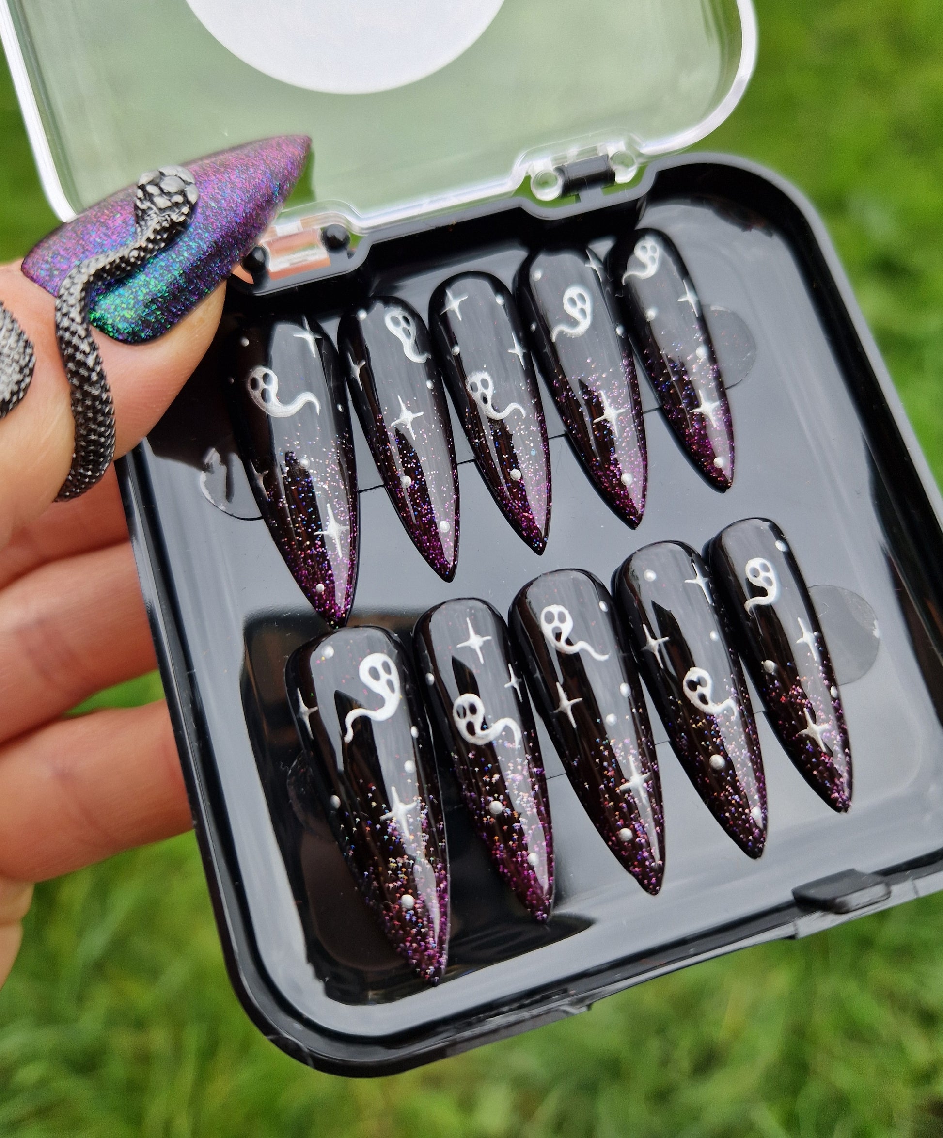 Python Nails GHOSTLY is a cute and spooky design sporting silver little ghosties with a black and purple glitter background.