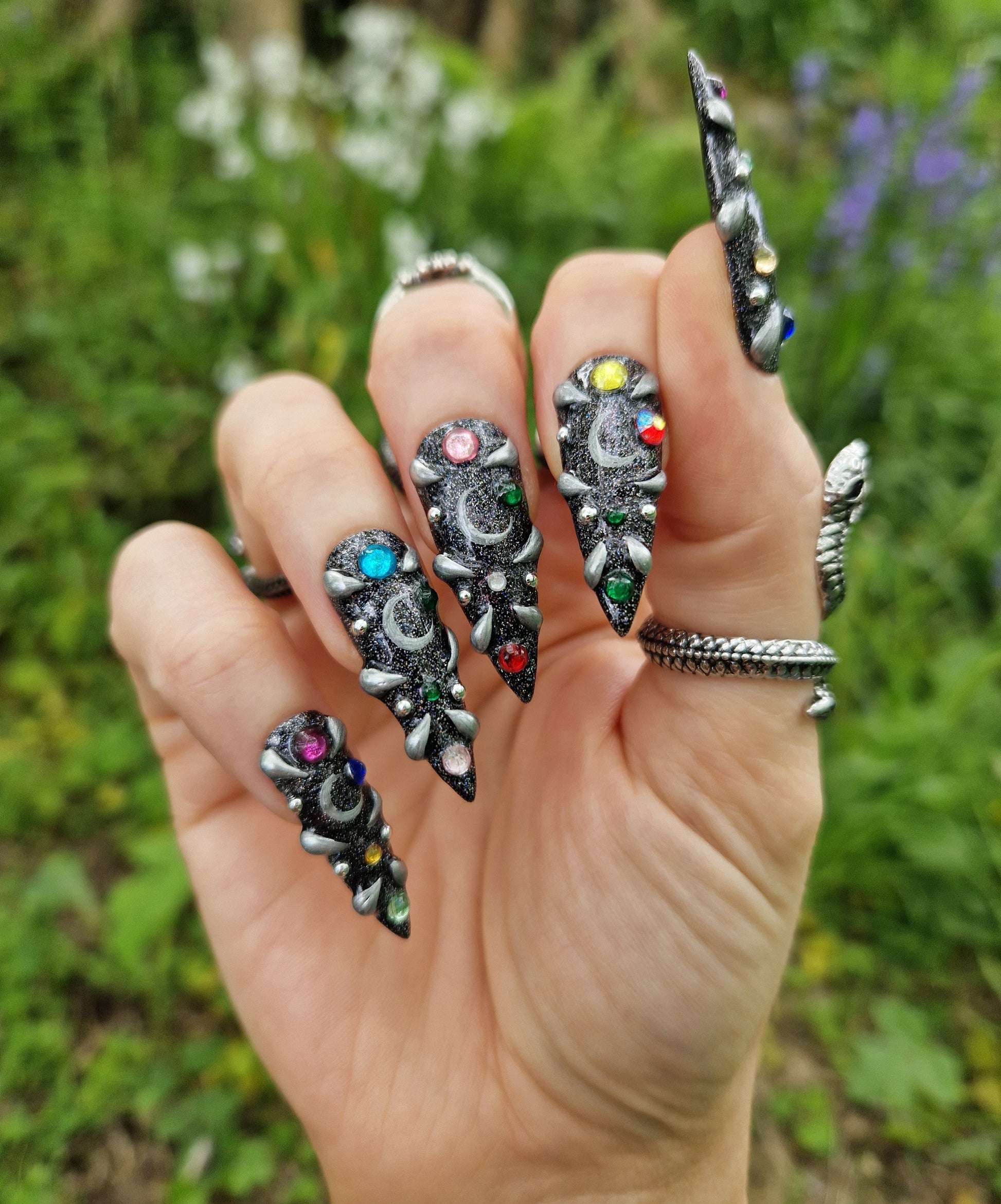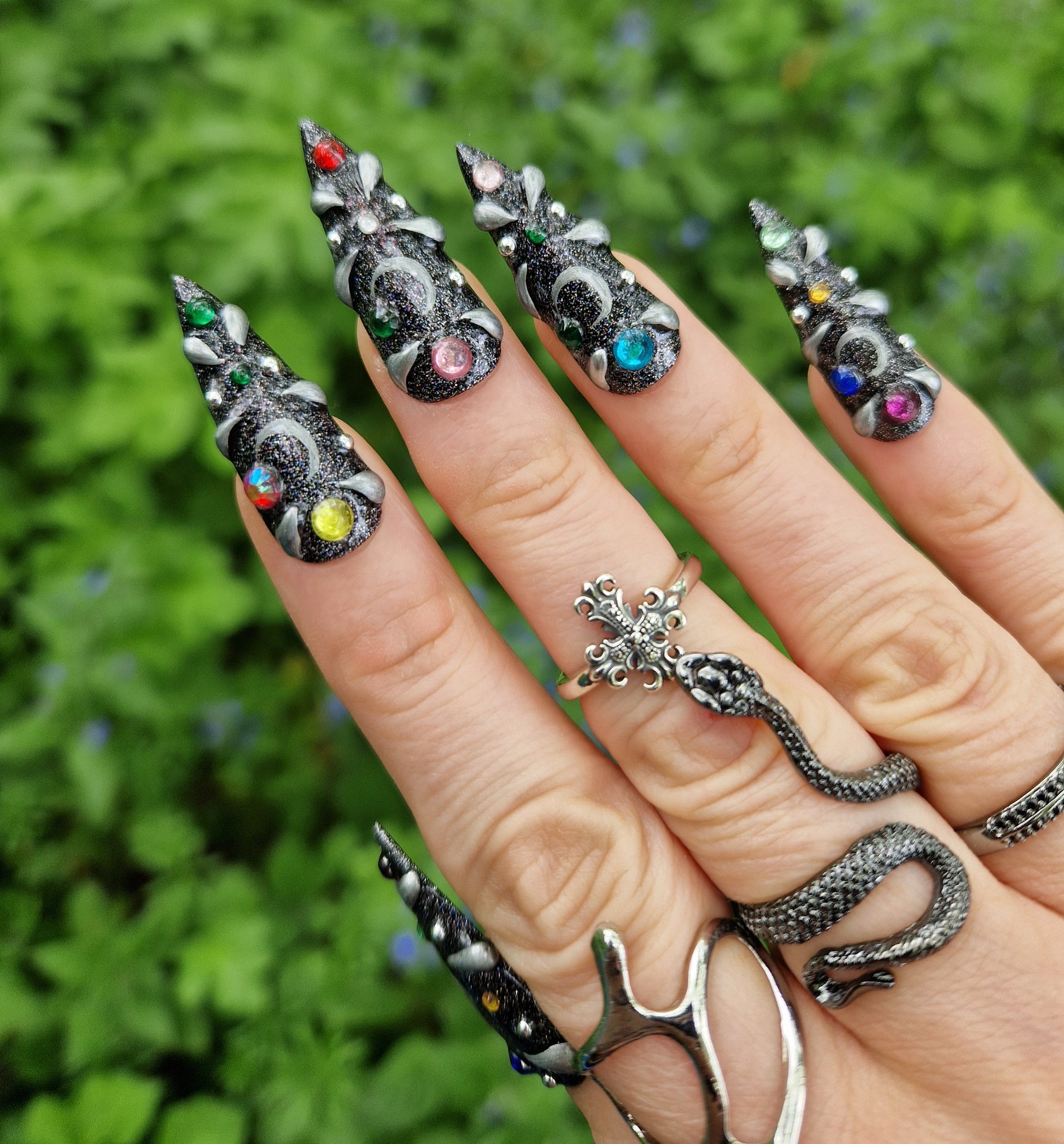 Python Nails GRASP THE MOON has a black holographic glitter background with 3d like claws grasping the nail with a central moon finished off with rainbow jewels.