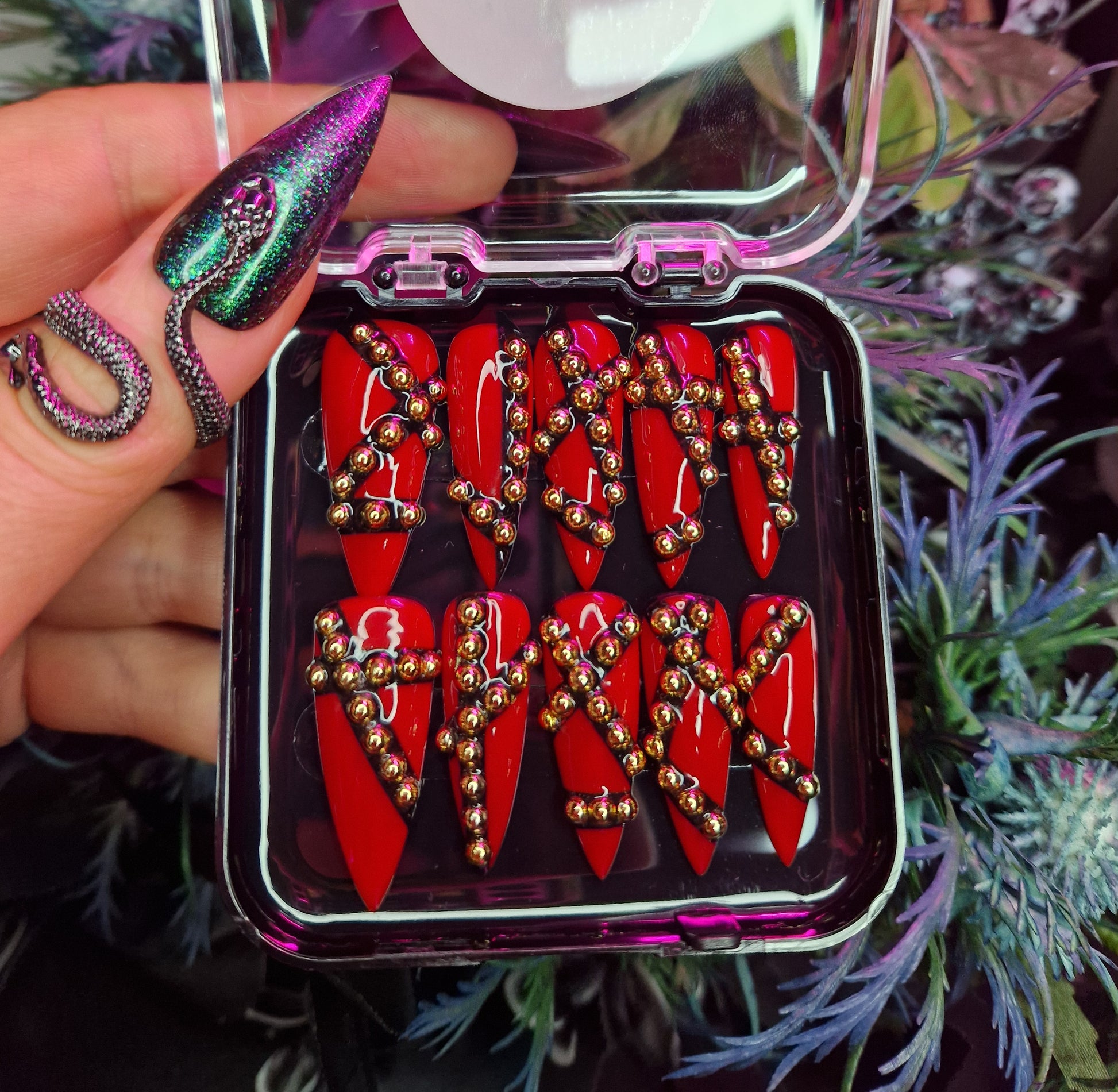 Python Nails GUARDED HEART are red with black and gold strap design.