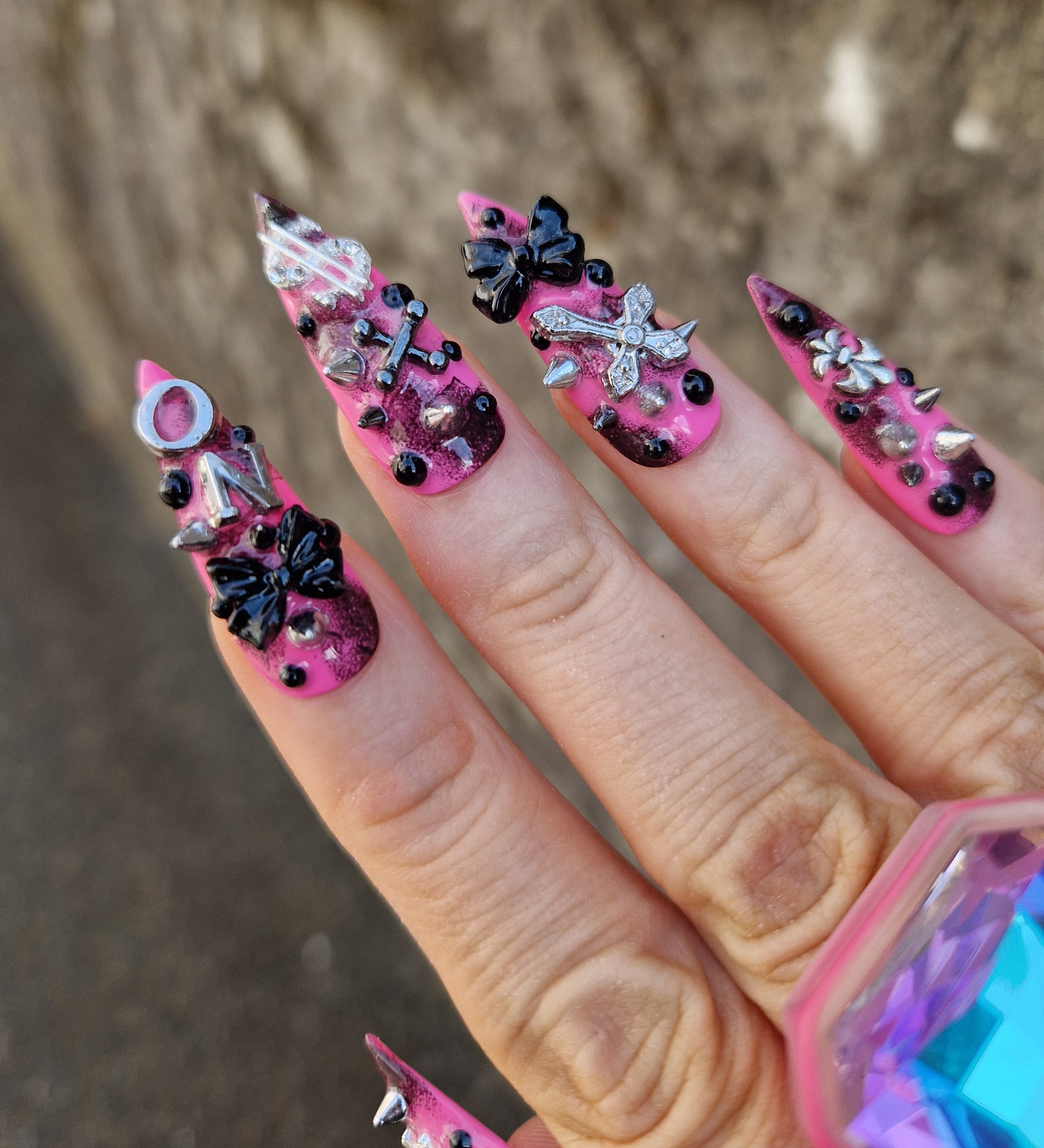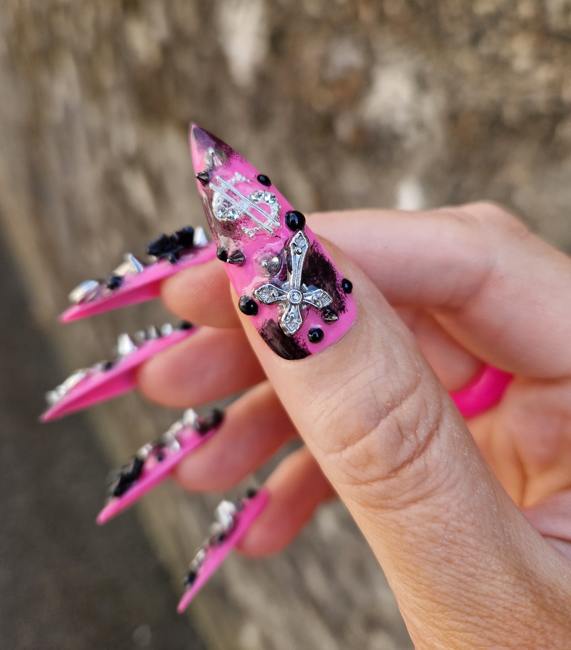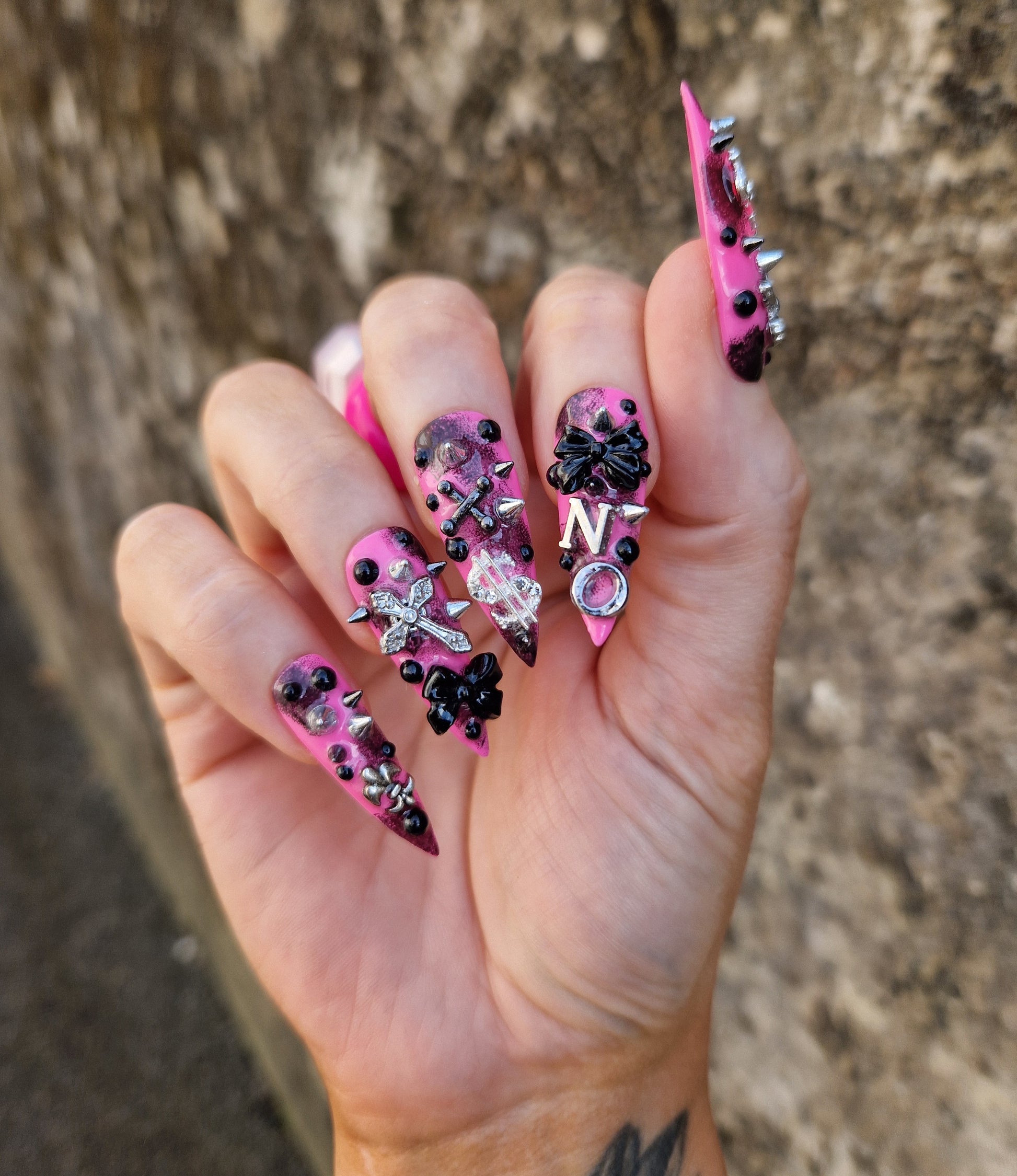 Python Nails JAWBREAKER are giving girly grunge y2k vibes with a black and pink base with punk style charms to match.