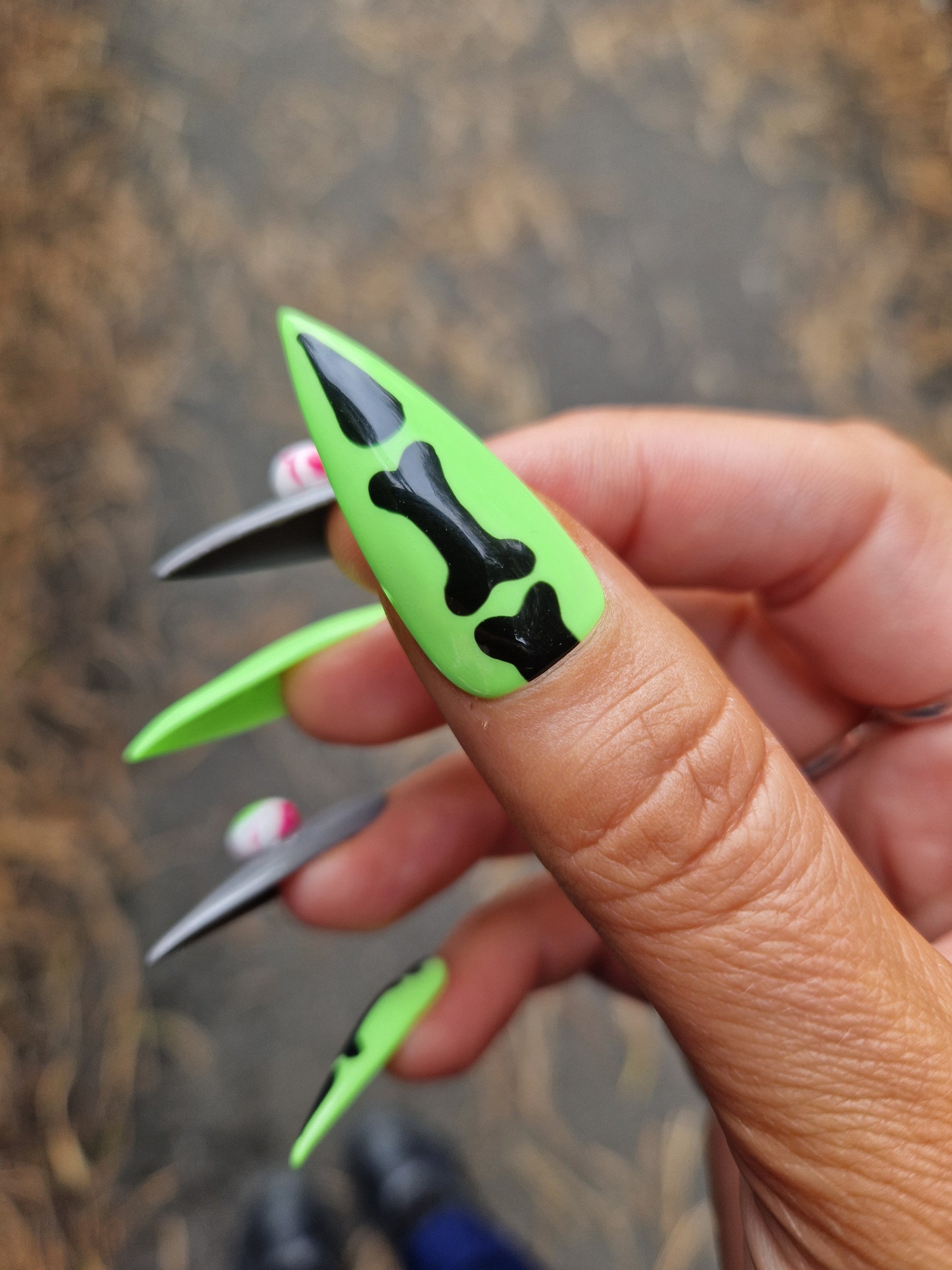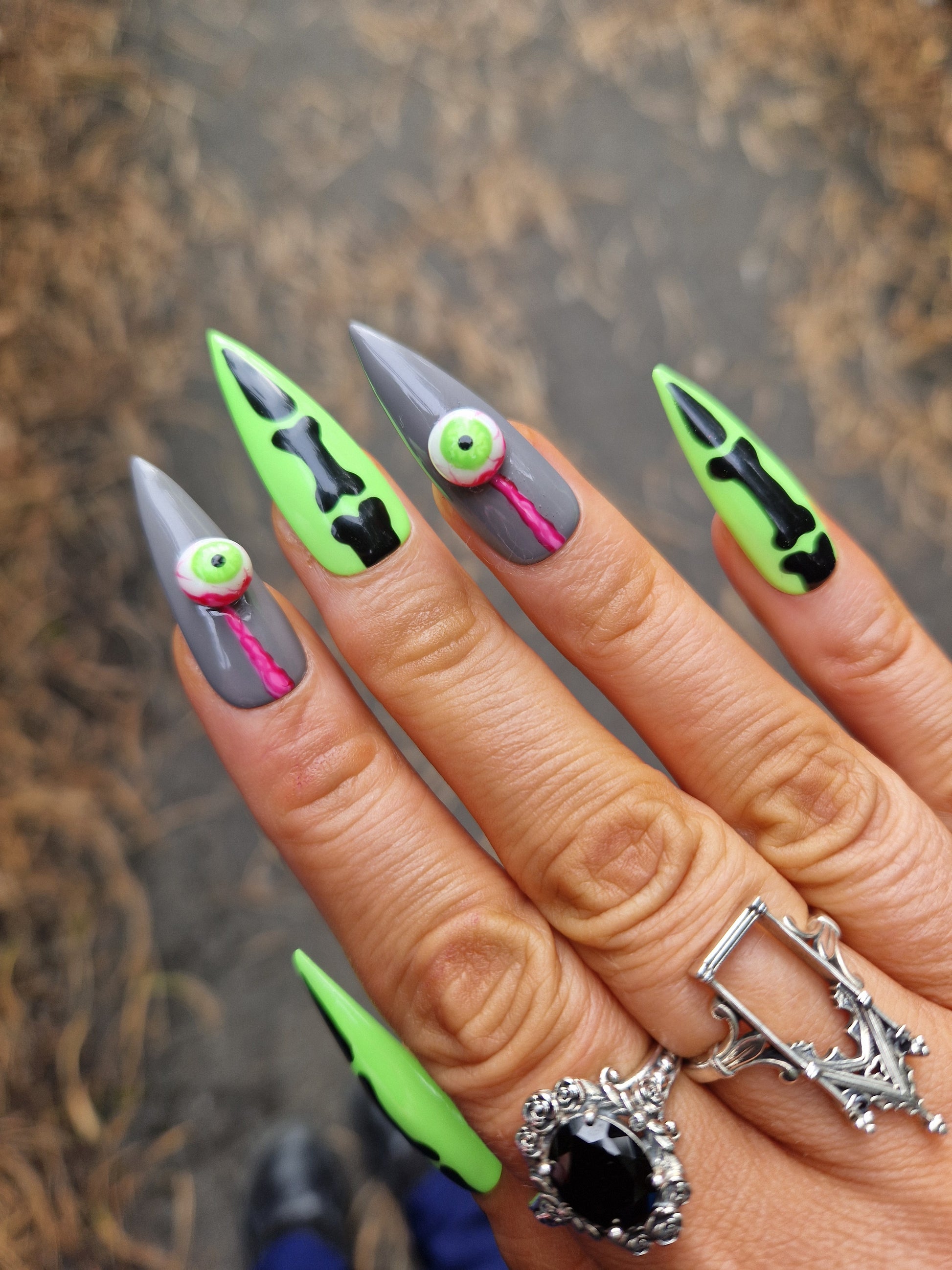Python Nails OPTIC CARCASS is a gorgeous green and grey combo with handmade 3d eyes and painted Skeleton fingers.