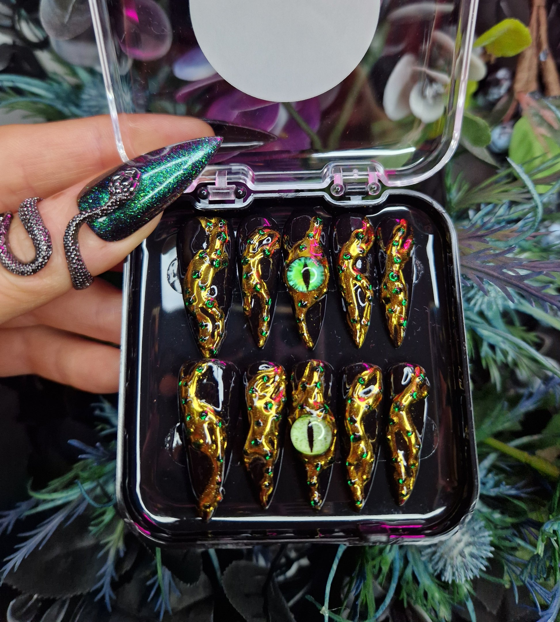 Python Nails RHAEGAL are a black base with what looks like an encrusted molten gold featuring a dragons eye in the centre.