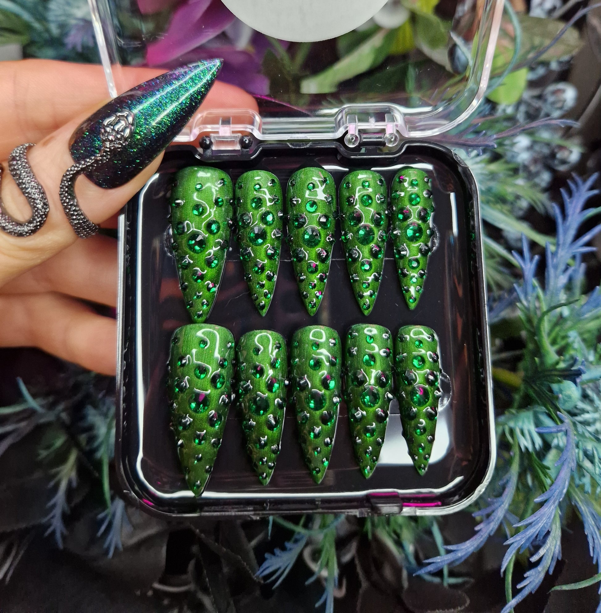 Python Nails WICKED is an all green rhinestone encrusted nail design.